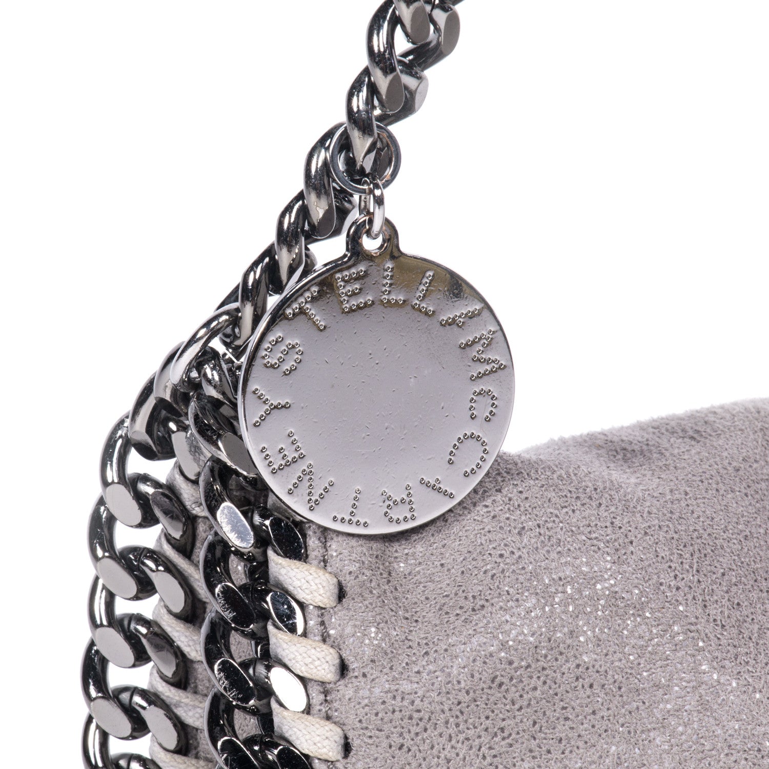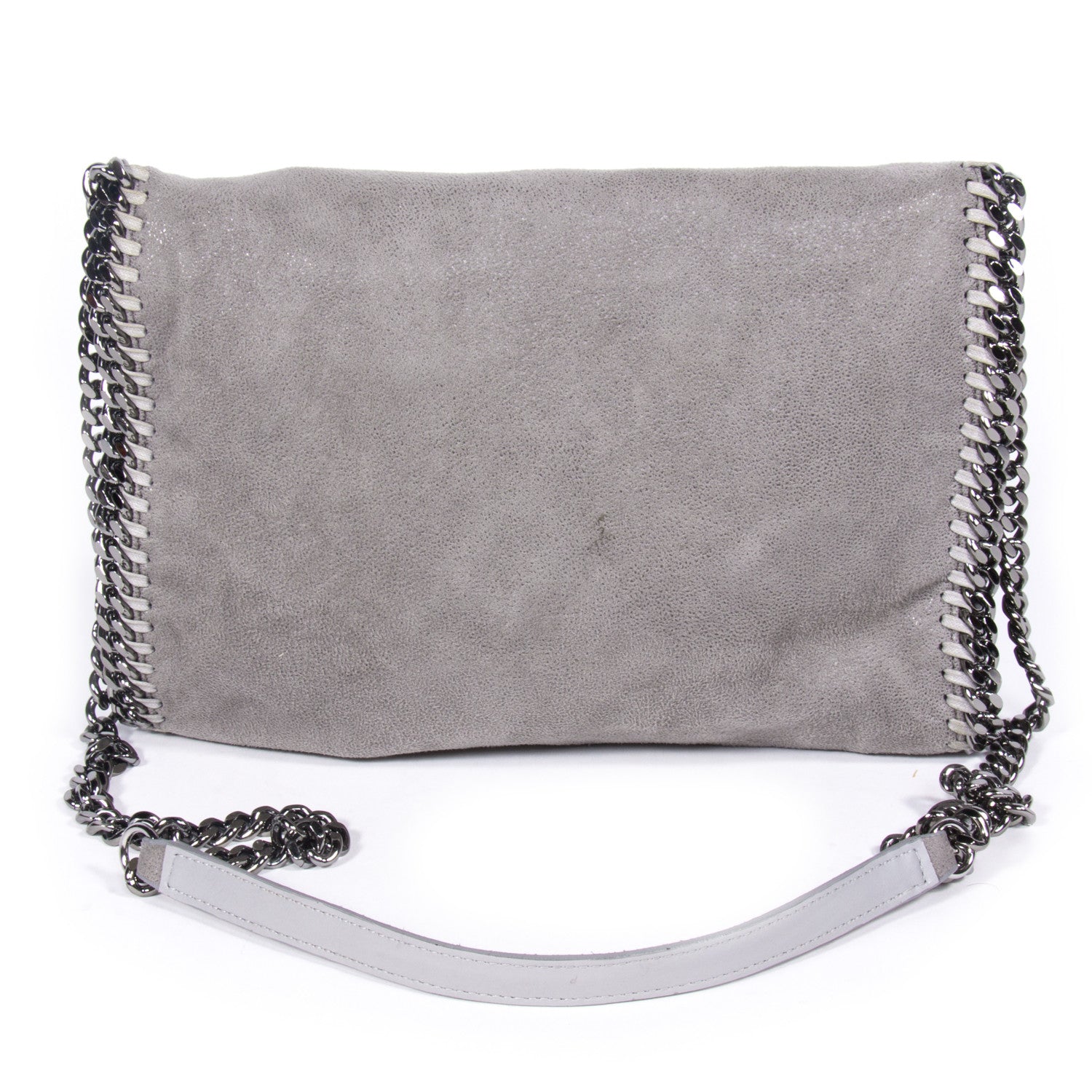 Details: Gray Vegan Leather / Crossbody / Gunmetal Hardware / Logo Medallion At Front / Whipstitch And Chain Trim / Single Chain Link Crossbody Strap / Gold Logo Print Interior Woven Lining / Single Compartment With Zip Pocket Closure At Interior Wall / Magnetic Closure At Front Flap
