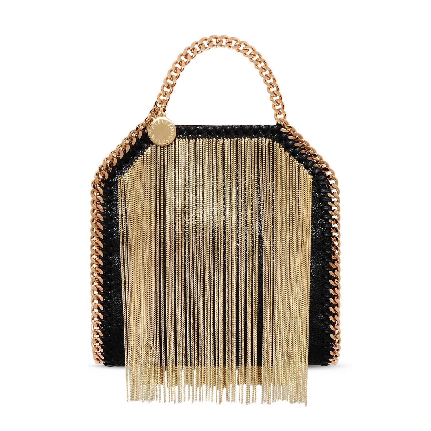 Details: Falabella Shaggy Deer Tiny Tote / Black With Gold Chain Fringing / Diamond Cut Gold Chain Trim and Handles / Magnetic Snap Closure / Pink Interior is Lined with Stella McCartney Logo Print Recycled Polyester.