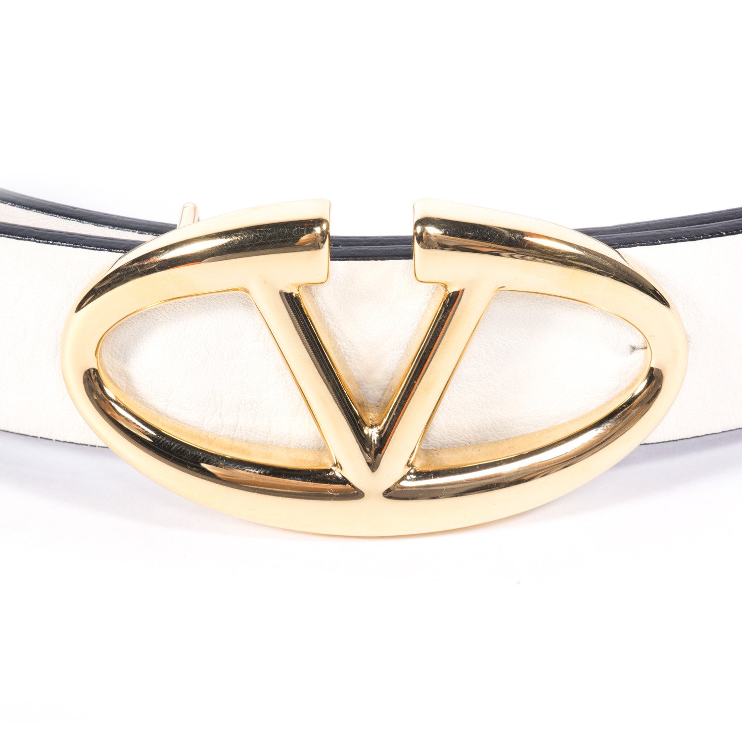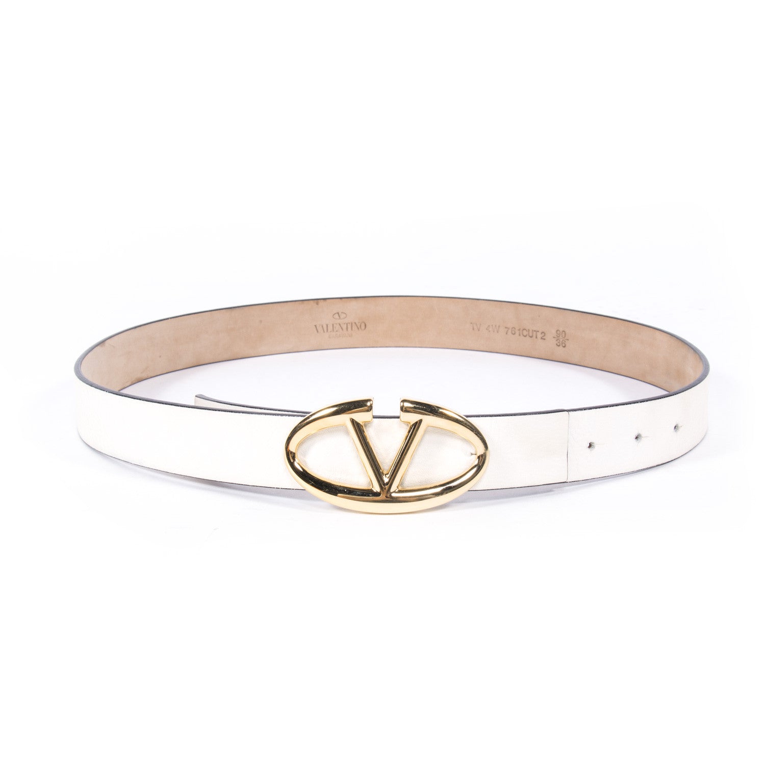 Details: White Leather Valentino / Tonal Stitching / Gold-Tone Hardware / V Accent Logo Buckle / Peg-In-Hole Closure