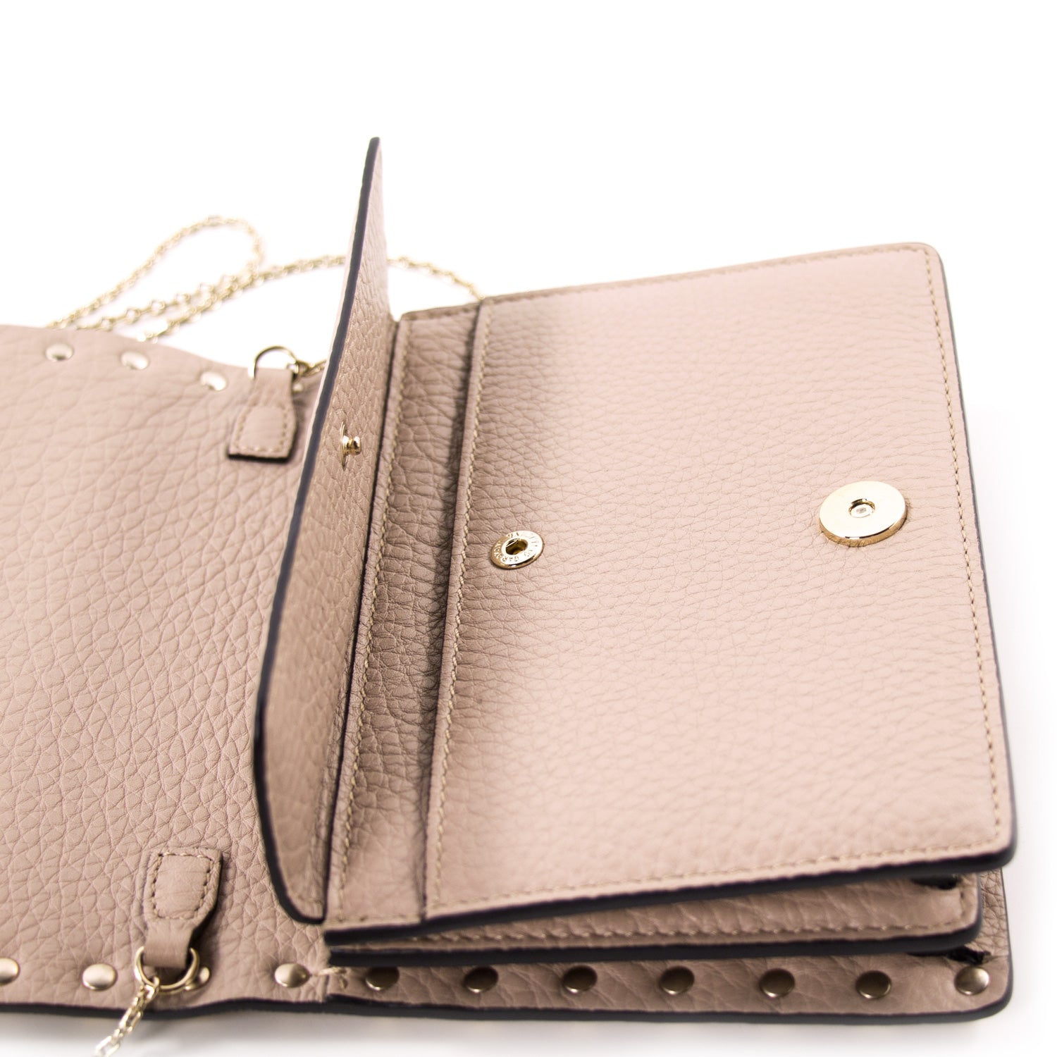 Details: Poudre Grained Calf Leather / Gold-Tone Hardware / Long Chain Shoulder Strap / Stud Embellishments Throughout the Front and Back / Leather and Suede Interior Lining / 3 Card Slots / One Zip Pocket / Snap Closure at Front Flap