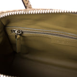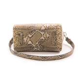 Details: Beige, Brown, and Grey Python Snake Skin / Silver-Tone Hardware / Dual Rolled Handles and Shoulder Strap / Metal Letters Logo at Front / Green-Olive Leather at Inside / Zip Pocket and Dual Slit Pocket at Interior Walls / Zip Closure at Top