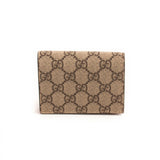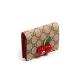 Details: GG Supreme Grey and Brown Coated Canvas / Cherry Adornment at Front with GG Logo in Gold / Red Leather Lining / Bill and Coin Compartments / Five Card Slots / Push Button Closure