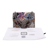 Details: Grey and Brown GG Coated Canvas / Patchwork Embroidery Throughout / Silver-Tone Hardware / Brown Suede Accent / Dual Chain Link / Exterior Pocket at Back / Pocket at Underside Flap / Suede Interior / Three Compartments, One with Zip Closure / Push-Lock Closure at Front Flap / Two-Headed Tiger Adornment