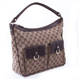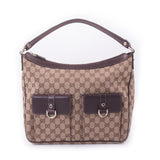 Details: Brown and Tan GG Canvas / Brass Hardware / Single Rolled Handle / Brown Leather Trim / Dual Pocket on Exterior Front / Brown Canvas Interior Lining / Dual Pockets at Inside one with Zipper / Zip Closure at Top