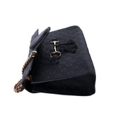 Details: Black Leather / Gold-Tone Hardware / Single Chain Shoulder Strap / Horsebit and Tassel Embellishment at Front Face / Brown Canvas Lining / Three Pockets at Interior / Fold-In Flap Closure at Front