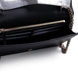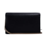 Details: Black Grained Leather / Light Gold-Tone Hardware / Logo at Front / Detachable Chain Shoulder Strap with Leather Pad / Single Compartment / 16-Card Slots / Zipper Pocket / Push Button Closure at Front