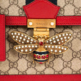 Details: Grey GG Coated Canvas / Brass Hardware / Blue and Red Web Accent / Red Leather Trim and Base / Red Leather Handle / Detachable Shoulder Strap / Gem Bee Embellishment at Front / Suede Interior Lining / Dual Compartments with Dual Pockets / Push-Lock Closure at Front Flap