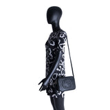 Details: Black Grained Leather / Gold-Tone Hardware / Adjustable Shoulder Strap / Logo at Front / Natural Canvas at Interior / Black Tassel / Dual Slit Pockets / Zipper Closure at Top