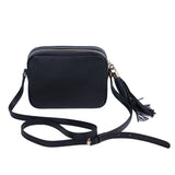 Details: Black Grained Leather / Gold-Tone Hardware / Adjustable Shoulder Strap / Logo at Front / Natural Canvas at Interior / Black Tassel / Dual Slit Pockets / Zipper Closure at Top