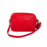 Details: Red Grained Leather / Gold-Tone Hardware / Adjustable Shoulder Strap / Logo at Front / Natural Canvas at Interior / Black Tassel / Dual Slit Pockets / Zipper Closure at Top