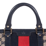 Details: Brown And Tan GG Canvas / Gold Tone Hardware / Navy Blue Leather Trim Accent / Dual Rolled Handles / Detachable Adjustable Shoulder Strap / Beige Interior Woven Lining / Dual Slit Pocket At interior / Zip Pocket At Interior Wall / Zip Closure On Top