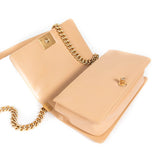 Description: Tan Calf Leather / Gold Hardware / Chain-Link and Leather Shoulder Strap / Single Compartment / Tan Fabric Lining / Single Slit Pocket at Inside / S-Lock Closure at Front Flap / Chevron Pattern Throughout the Front and Back