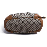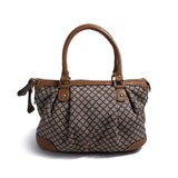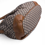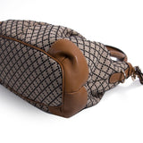 Details: Beige Canvas and Brown Leather Trim / Gold Tone Hardware / Dual Rolled Handles / Detachable Adjustable Shoulder Strap GG Logo Charm at Front / Black Fabric Lining / Zipper and Flat Pockets at Inside / Zipper Closure at Top