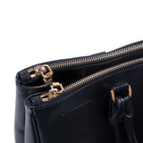 Details: Black Saffiano Leather / Gold-Tone Hardware / Dual Rolled Handles / Black Fabric Lining / Three Compartments, Two with Zip Closure / Four Pockets at Interior, One with Zip Closure.