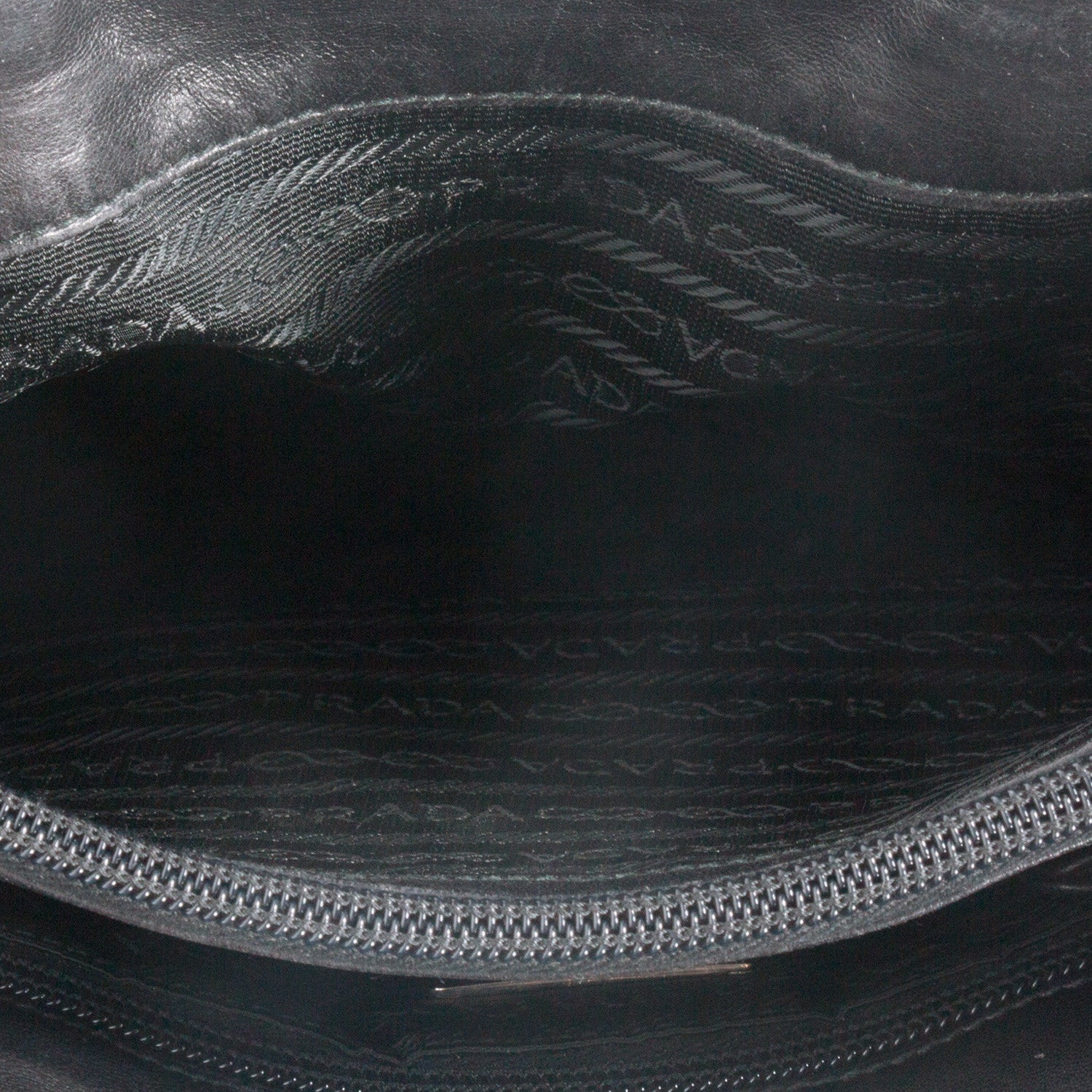 Details: Black Prada Tote / Silver Tone Hardware / Tonal Stitching / Logo At Front / Dual Rolled Top Handles / Black Logo Print Woven Lining / Three Compartment, One / Zipper Pocket At Interior Wall