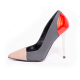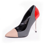 Details: Woven Nylon Pumps With Matt Beige Cap-Toes / Emerald Red Patent Leather Counters and Reflective Heels / Sophisticated Color and Mixed textures / Woven Grey Fabric / Metallic Red Patent Heel Counter / Mirrored Stiletto heel / Leather insole and Sole