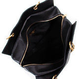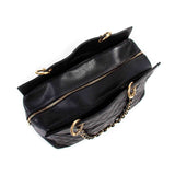 Details: Black Caviar Leather / Gold-Tone Hardware / Dual Rolled Chain-Link Straps / Dual Compartments Separated by a Zipper Compartment / Zipper and Flat Pocket at Inside Wall