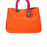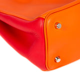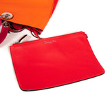 Details: Orange and Fuchsia Calf Leather / Silver-Tone Hardware / Dual Rolled Handles / Fuchsia Leather Lining / Dual Interior Pockets / Magnetic Snap Closure At Top / Protective Studs At Base / Logo Charm On Front / Detachable Pouch