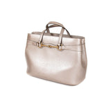 Details: Champagne Leather / Brass Hardware / Dual Rolled Handles / Detachable and Adjustable Shoulder Strap / Horsebit Adornment at Front / Beige Canvas Lining / Three Compartments / Four Pockets at Interior, One with Zipper / Open Top