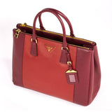 Details: Red Cerise Saffiano Leather / Gold Tone Hardware / Double Zip / Dual Rolled Handles / Logo At Front Face / Protective Studs At Base / Tonal Red Jacquard Interior Lining / Three Interior Compartments: Two With Zippers / Four Interior Pockets, One With Zip Closure