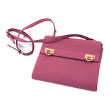 Details: Purple Grained Leather / Gold-Tone Hardware / Adjustable Shoulder Strap / Exterior Zipper Pocket at Back / Chocolate Leather Lining / Three Interior Compartments, One with Zip Closure / Dual Gancio Flip-Lock Closure at Front