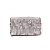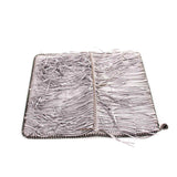 Details: Silver Metallic Shaggy Deer Fabric / Silver-Tone Gunmetal Hardware / Printed Jacquard Lining at Interior / Dual Compartments / One Zipper / Fold Over Closure / Fringes Embellishment Throughout the Exterior