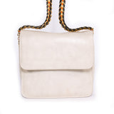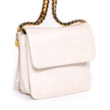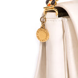 Details: White Leather / Shoulder Bag / Gold Chain / Faux Leather Handle / Flap Front And Snap Closure / Stella McCartney Logo disc And Three Inside Compartments / Black Jacquard Interior Lining