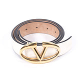 Details: White Leather Valentino / Tonal Stitching / Gold-Tone Hardware / V Accent Logo Buckle / Peg-In-Hole Closure
