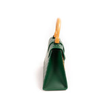 Details: Green Leather and Multicolor Coated Canvas / Silver-Tone Hardware / Wooden Top Handle and Trim / Marigold Canvas Lining / Single Zipper pocket at Inside / Fold-in Flap Closure at Front