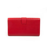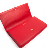 Details: Red Textured Leather / Gold Tone Hardware / Designer Logo At Front / Red Satin Interior Lining / Single Compartment / Single Flat Pocket / Magnetic Snap Closure at Front Flap