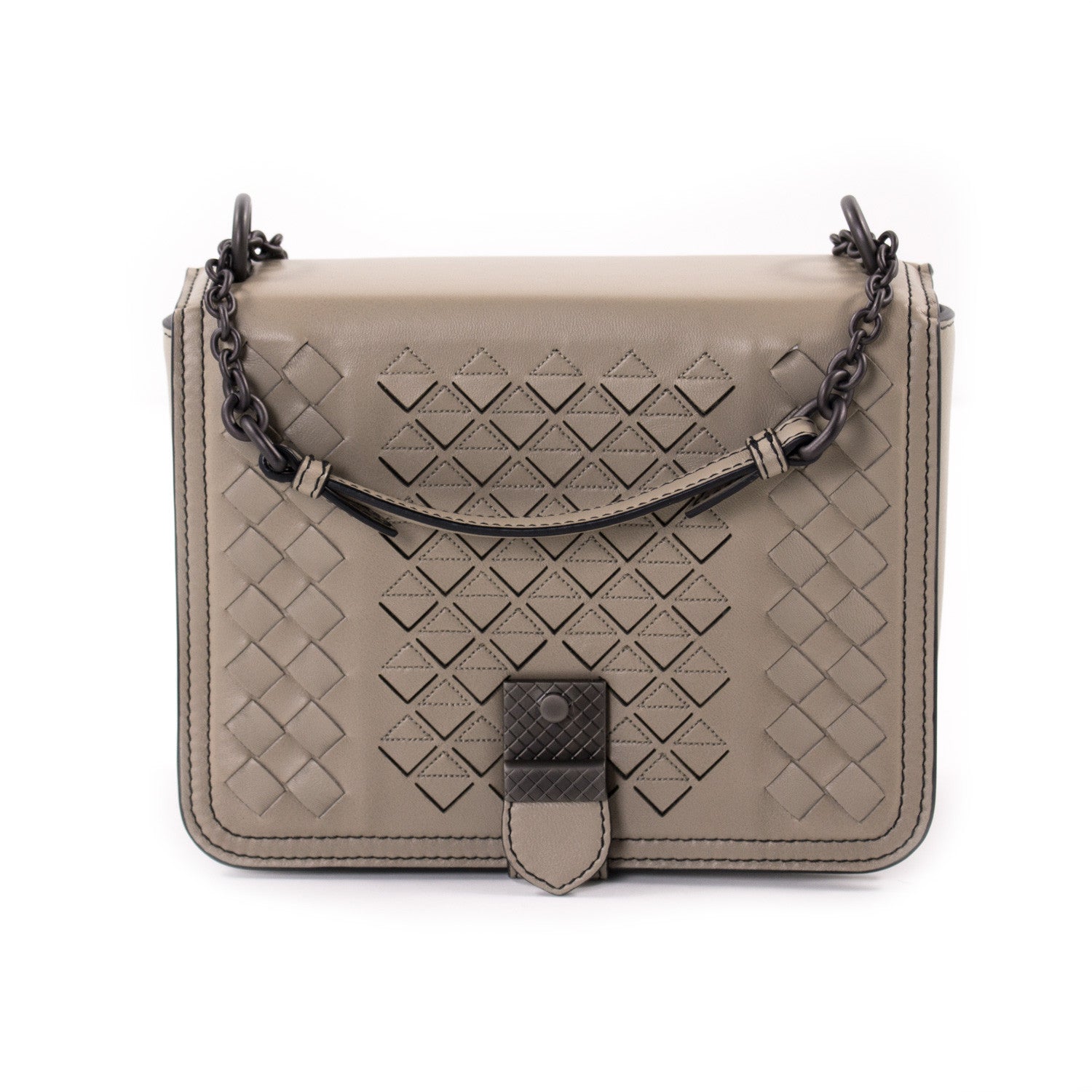 Details: Grey Nappa Leather / Black Metal Hardware / Chain-Link Shoulder Strap With Leather Pad / Suede Interior Lining / Flat Pocket at Inside / Three Compartments / Push Lock Closure at Flap With Engraved Gunmetal Lock at Exterior Front