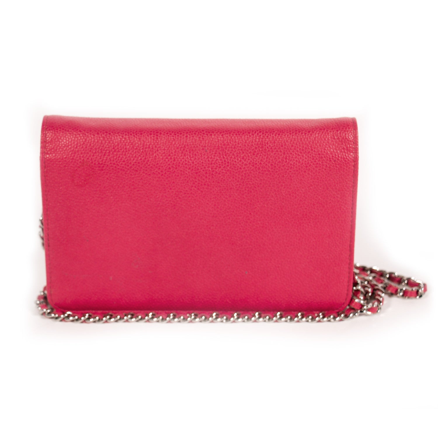Details: Pink Caviar Grained Leather / Silver-Tone Hardware / Chain-Link Shoulder Strap With Pink Leather Accent / Interior Leather And Satin Lining / Single Compartment / Three Pockets At Interior, One With Zip Closure / Six Card Slots At Interior Wall / Zip Pocket Inside The Front Flap / Push Button Closure At Front Flap