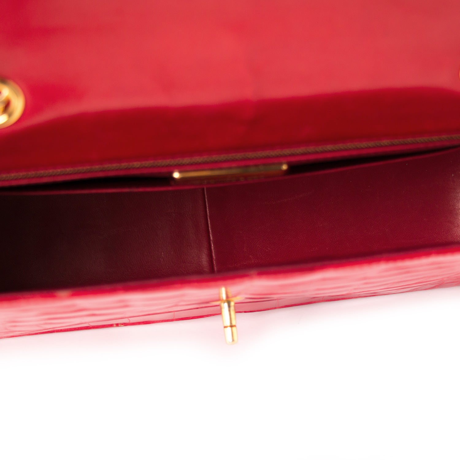 Details: Red Crocodile Leather / Gold-Tone Hardware / Chain-Link Leather Shoulder Strap / Leather Lining / Single Compartment with Flat and Zip Pocket / Single Flap at Front with Turn-Lock Closure