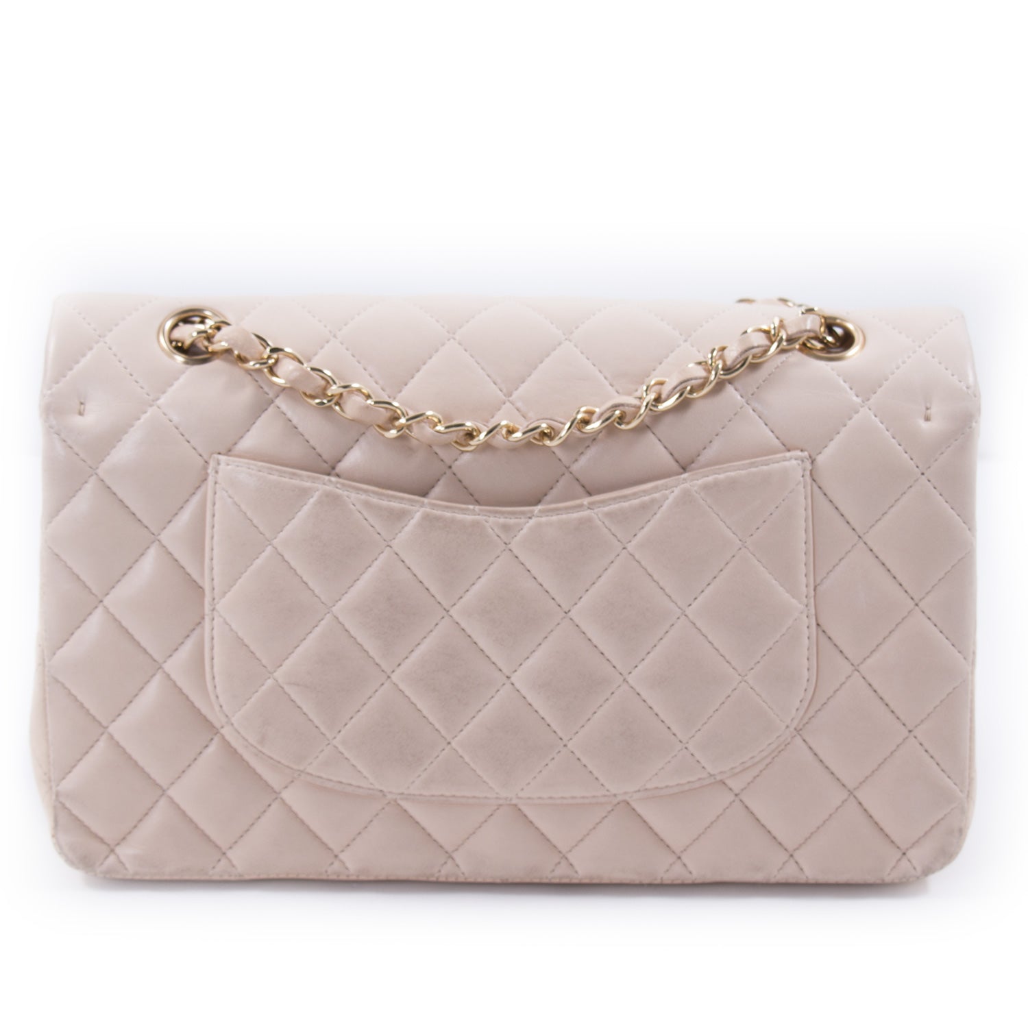 Details: Pale Pink Lambskin Quilted Leather / Gold-Tone Hardware / Dual Leather and Chain-Link / Flat Pocket at Exterior Back / Pale Pink Leather Lining / Dual Compartments / Two Flat Pockets at Inside / Interior Flap Closure with Push Button Closure / Turn Lock Closure at Front Flap