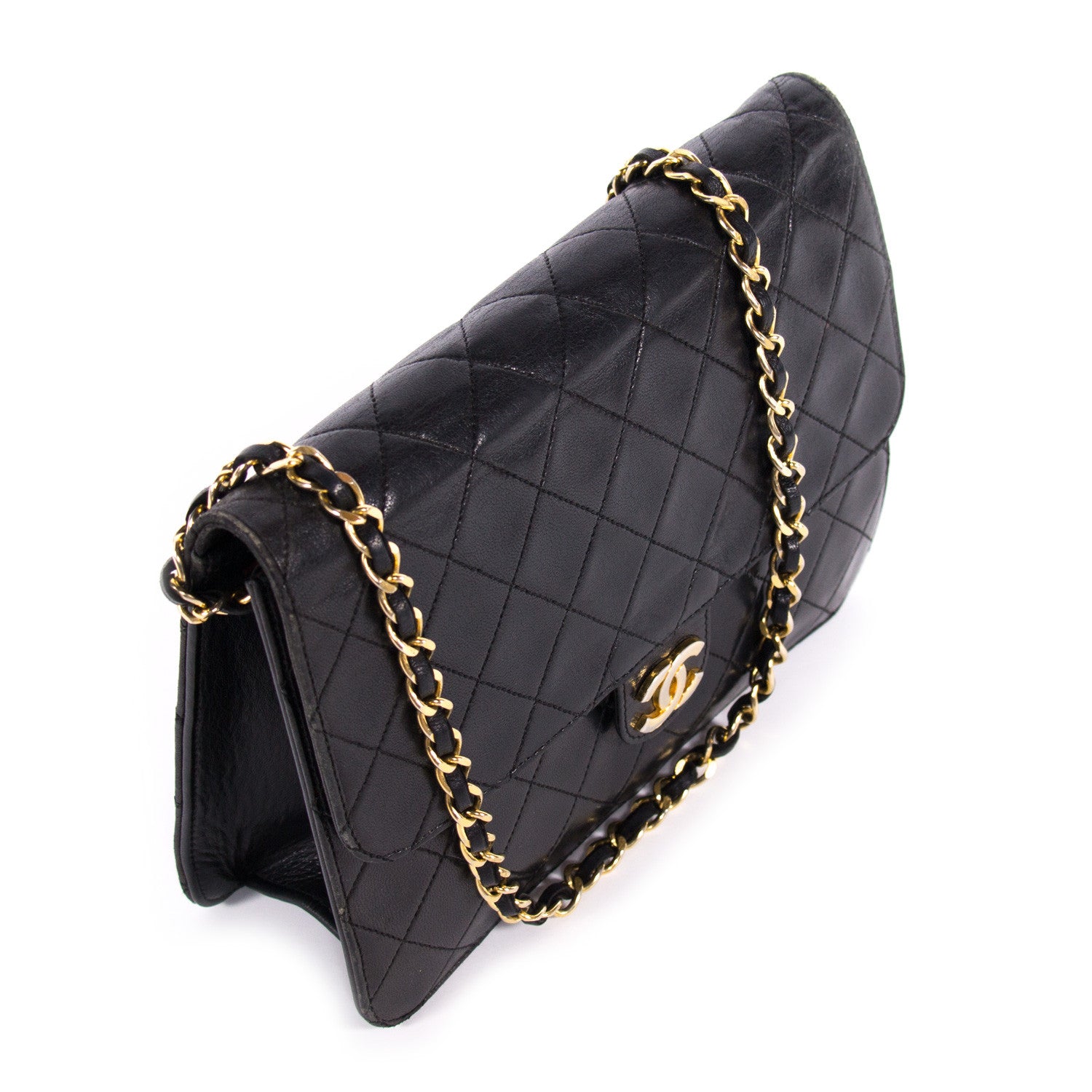 Details: Black Quilted Lambskin Leather / Gold Tone Hardware / Single Chain-Link And Leather Accent Shoulder Strap / Burgundy Leather Interior Lining / Single Zip Pocket At Interior Wall / Flap Closure At Front With Push Lock