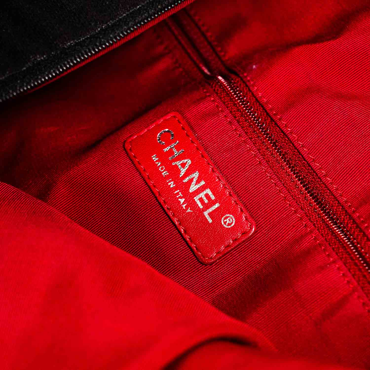 Details: Black Quilted Jersey / CHANEL, LA Stitching at Front / Silver-Tone Hardware / Chain Link and Leather Strap / Red Canvas Interior Lining / One Compartment with One Zip Pocket / Zipper Closure at Top