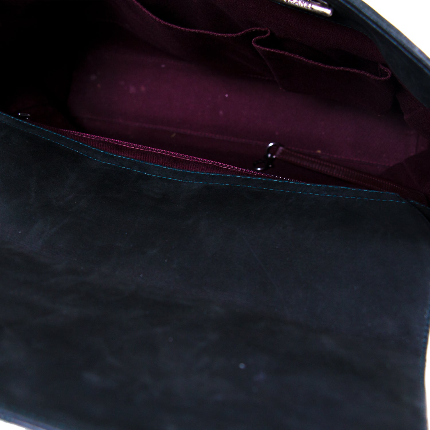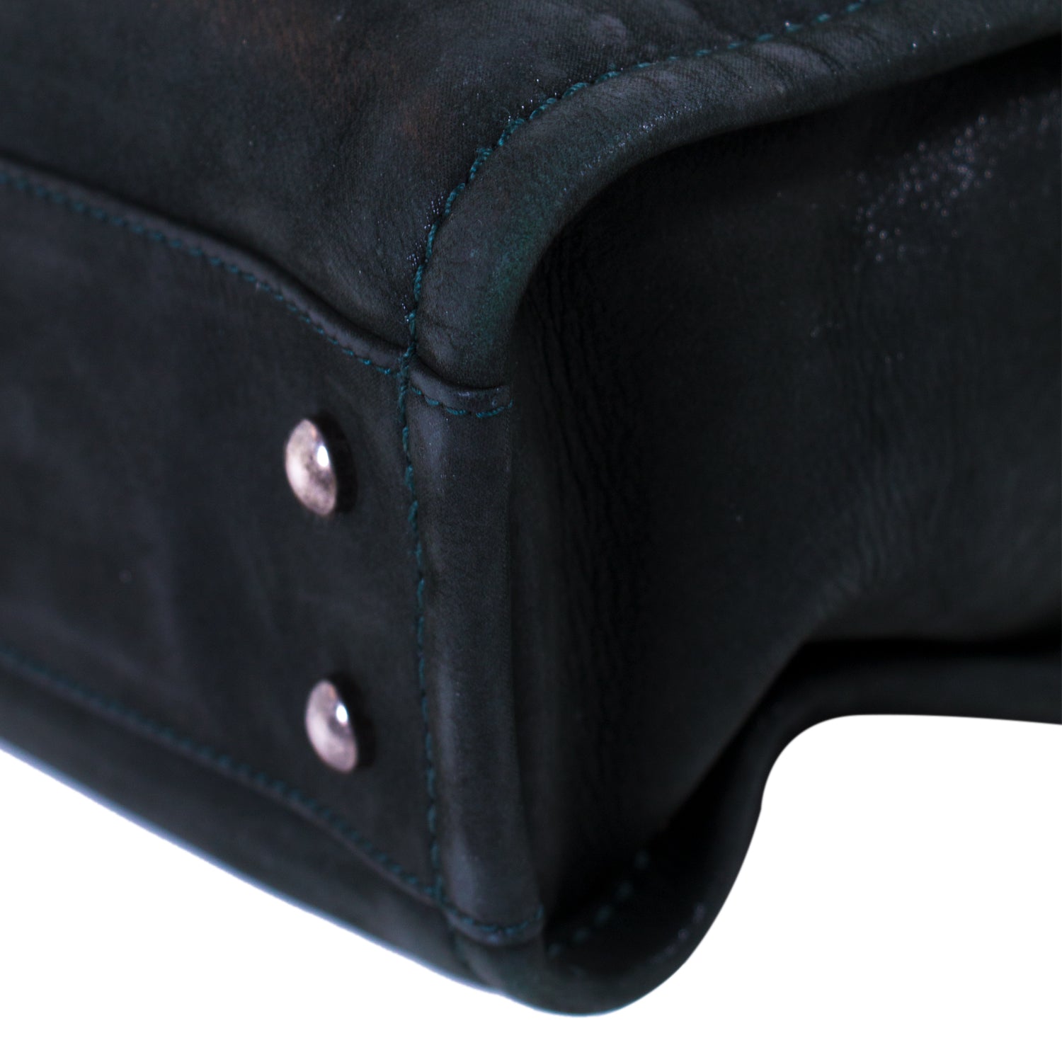 Details: Dark Green Iridescent Suede / Glazed Patent Calf Leather / Dual Brown Leather Handles / Dual Leather-Chain Shoulder Strap / Single Compartment with Dual Flat Pockets and One Zipper Pocket / Turn-Lock Closure at Flap