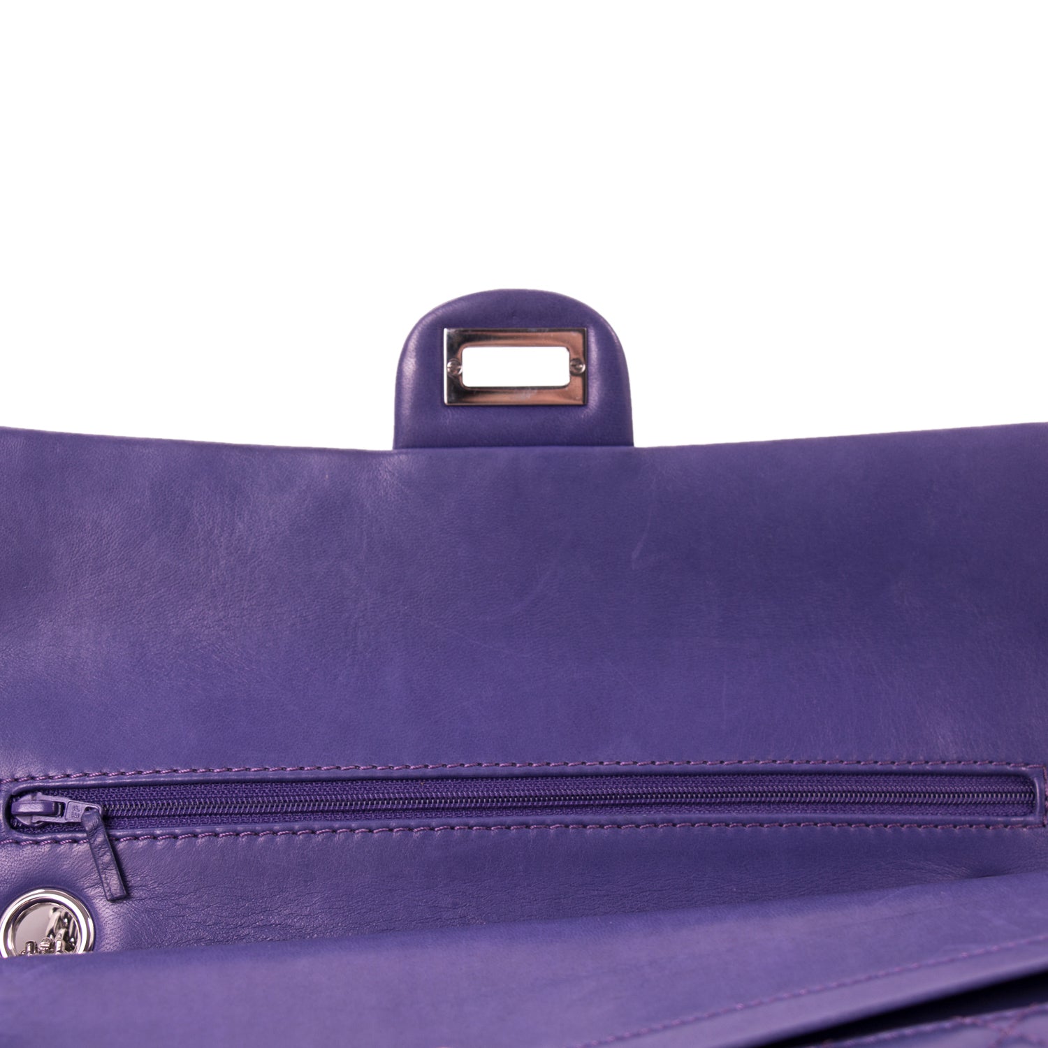 Details: Purple Quilted Leather / Silver-Tone Hardware / Chain-Link Shoulder Strap / Exterior Pocket at Back / Leather Lining / Dual Flat Pockets at Zipper Pocket at Insider Flap / Dual Flap with Button and Turn-Lock Closure