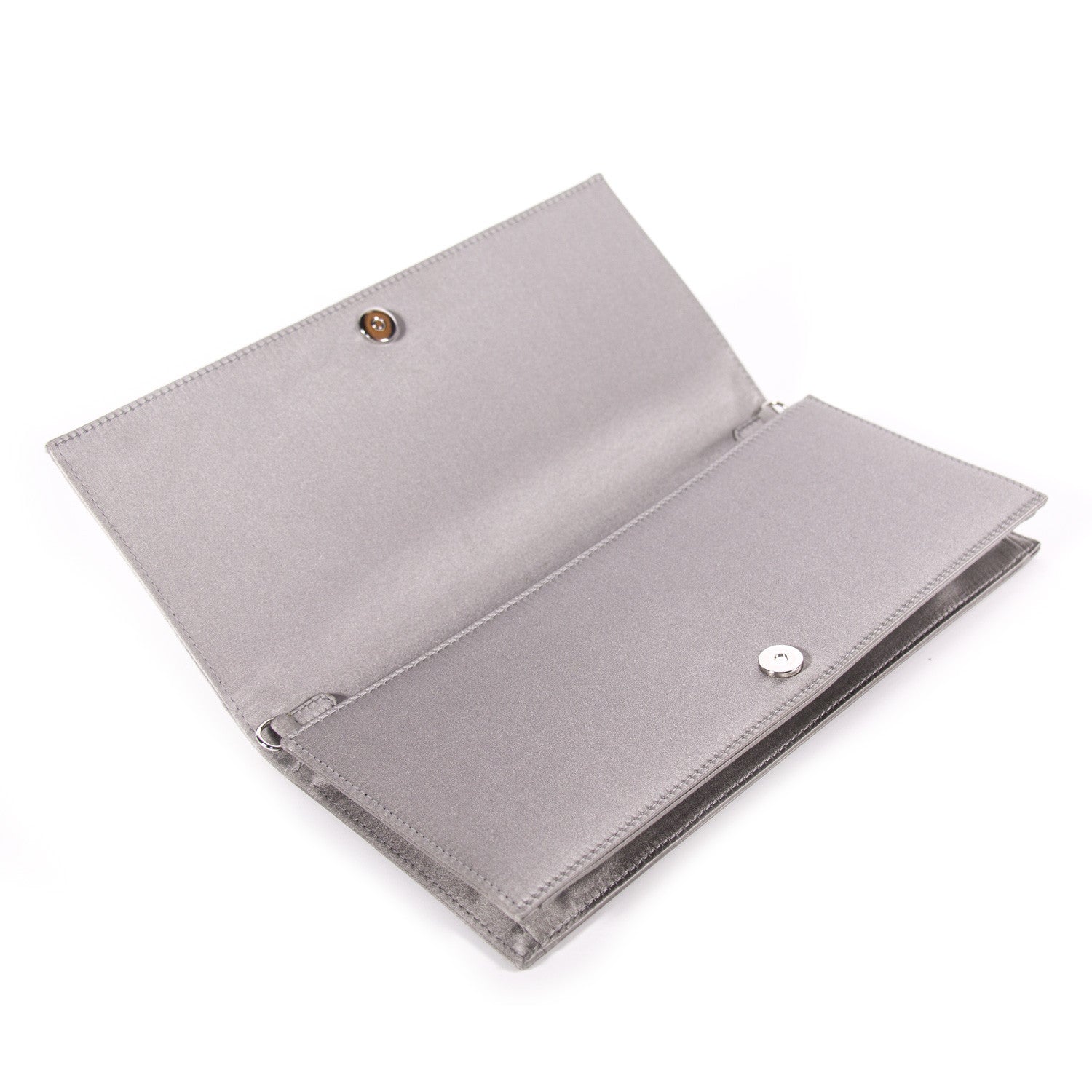 Details: Grey Cannage Satin / Silver Tone Hardware / Crystal Embellishment At Front And Back / Detachable Shoulder Strap / Grey Satin Lining At Interior / Single Compartment / Single Slit Pocket / Magnetic Snap Closure At Front
