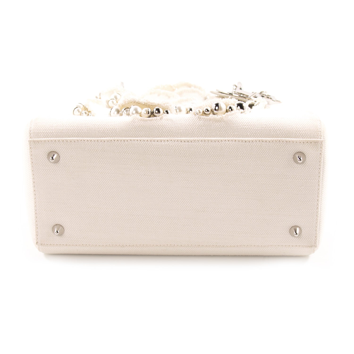 Details: Beige and Beige Canvas with Crocodile Leather / Silver-Tone Hardware / Dual Rolled Handles / Floral Embellishment at Front Face with Mise En Dior Pearl Embroidery / Single Compartment / Zip Pocket at Interior / Zip Closure at Top