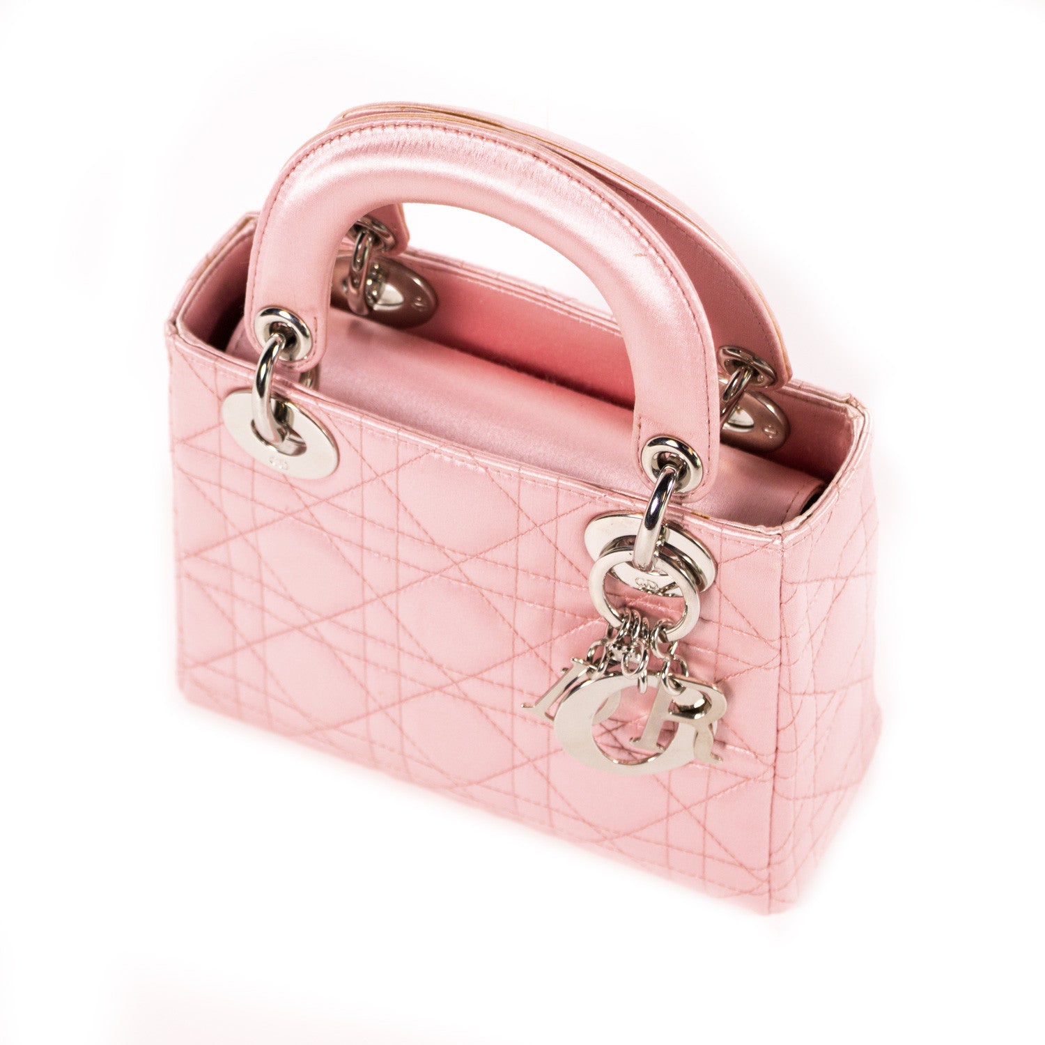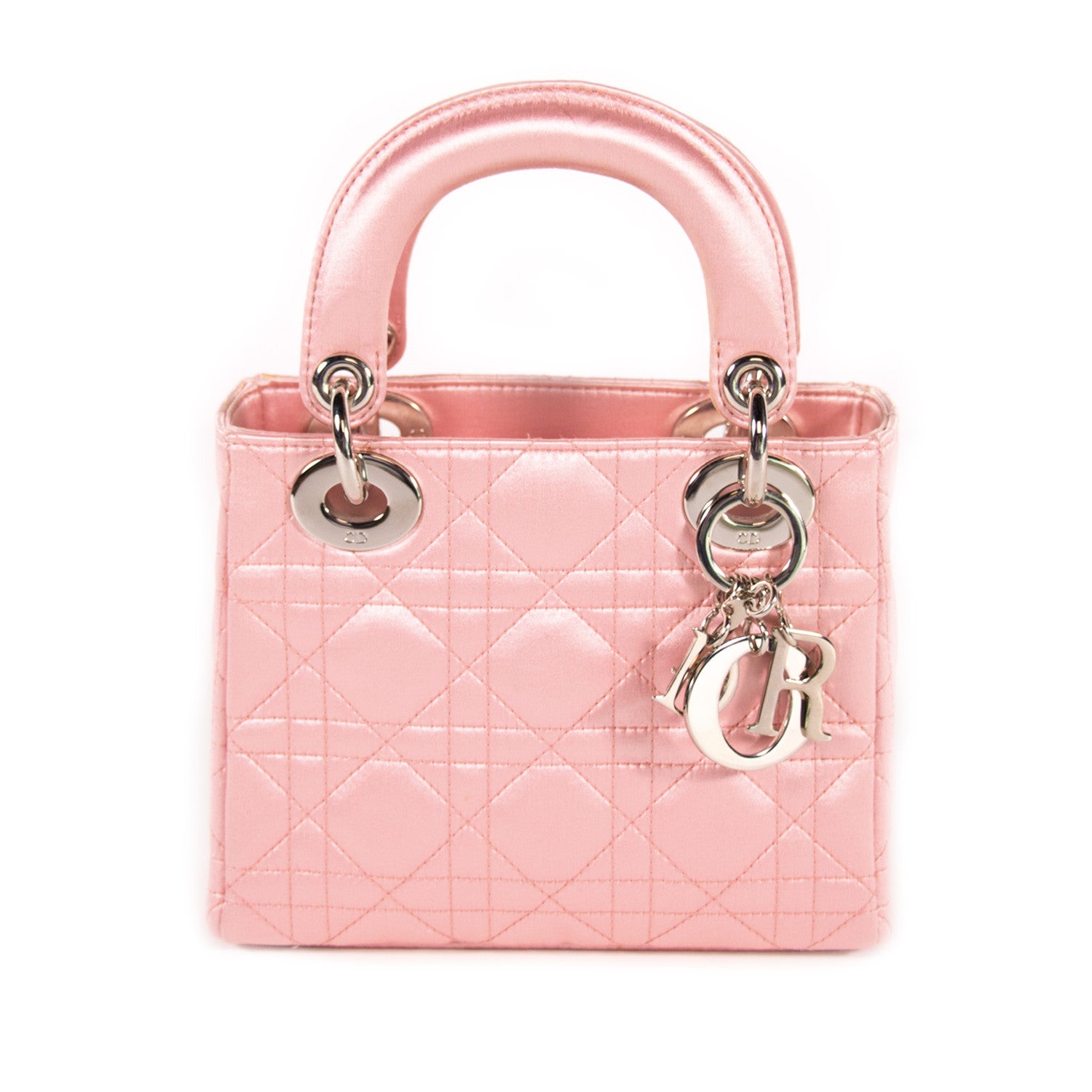 Details: Pink Satin In Cannage Pattern / Silver-Tone Hardware / Dual Rolled Handles / Designer Logo Charm At Front / Tonal Grey Jacquard Lining At Interior / Single Zip Pocket At Interior / Flap Closure At Top