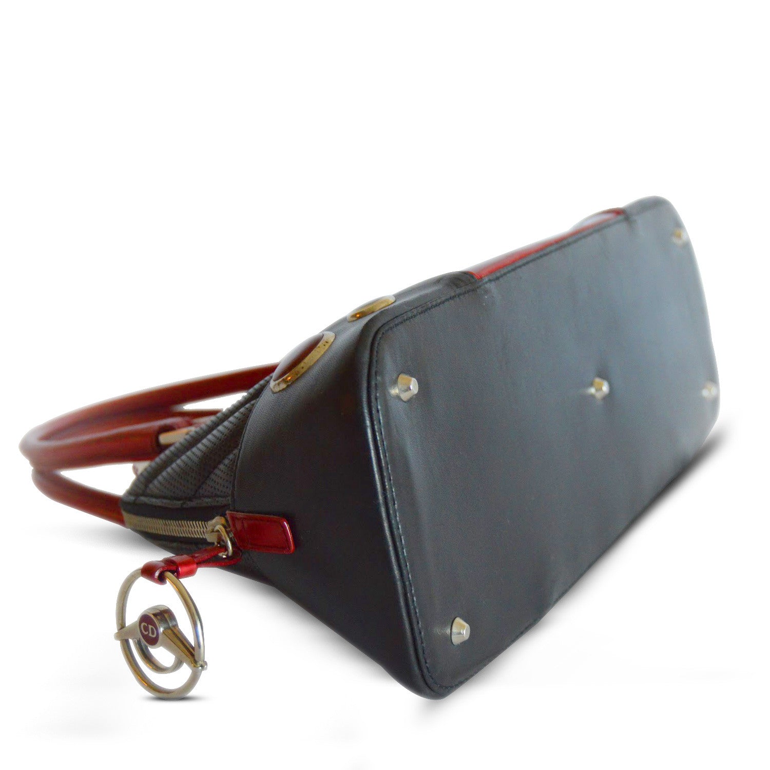 Details: Black Perforated Leather And Red Patent Leather / Silver-Tone Hardware / Tonal Stitching Throughout / Signature License Plate Detail / Automobile Hood Ornament-Inspired Key Chain / Dual Rolled Handles / Black Interior / Double Pockets At Interior Walls: Snap Closure And Zip-Around Closure