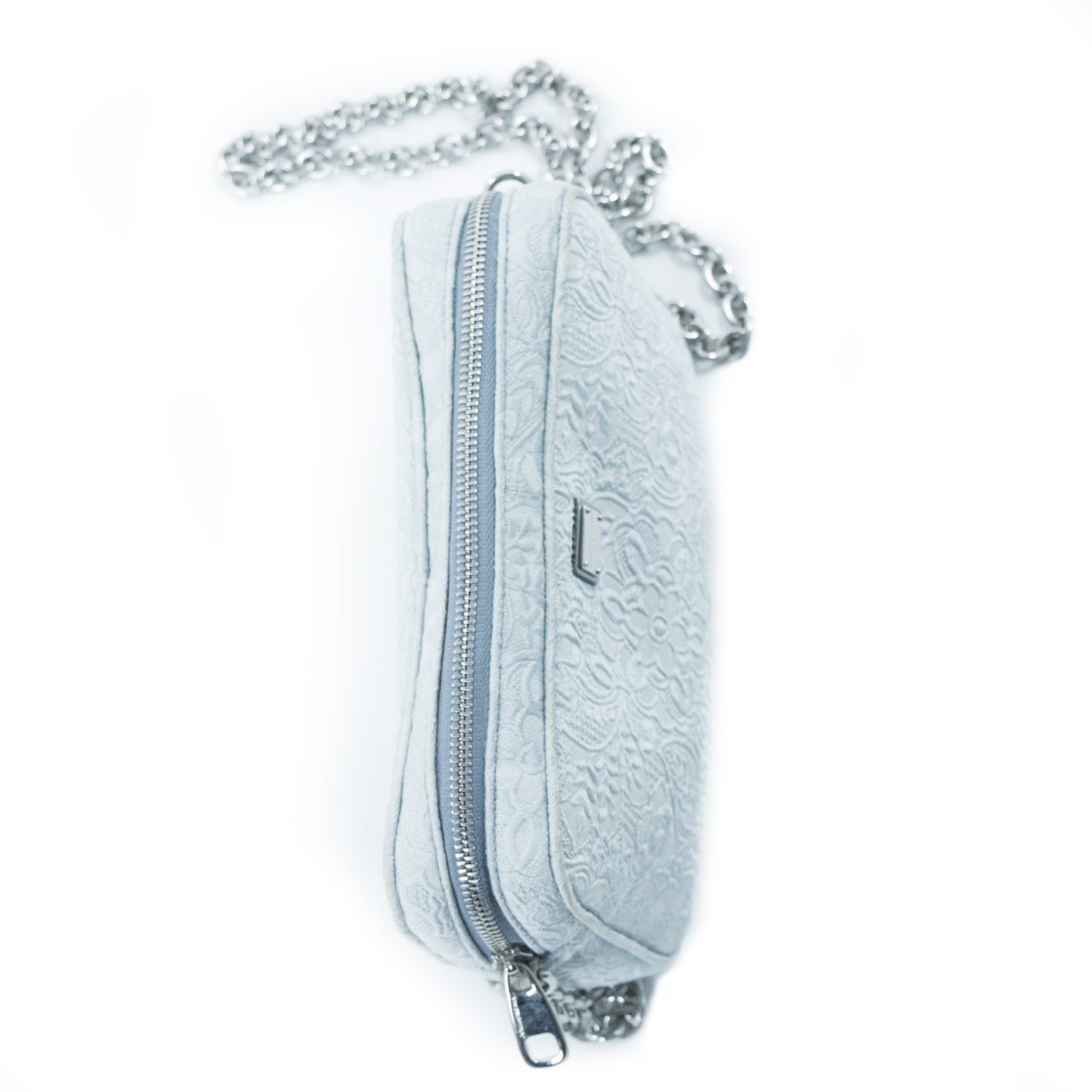 Details: Light Blue Fabric / Silver-Tone Hardware / Metal Plate Logo at Front / Long Chain Strap / Grey Satin Lining with Leopard Prints Flat Pocket / Zipper Pocket at Inside / Zipper Closure at Top