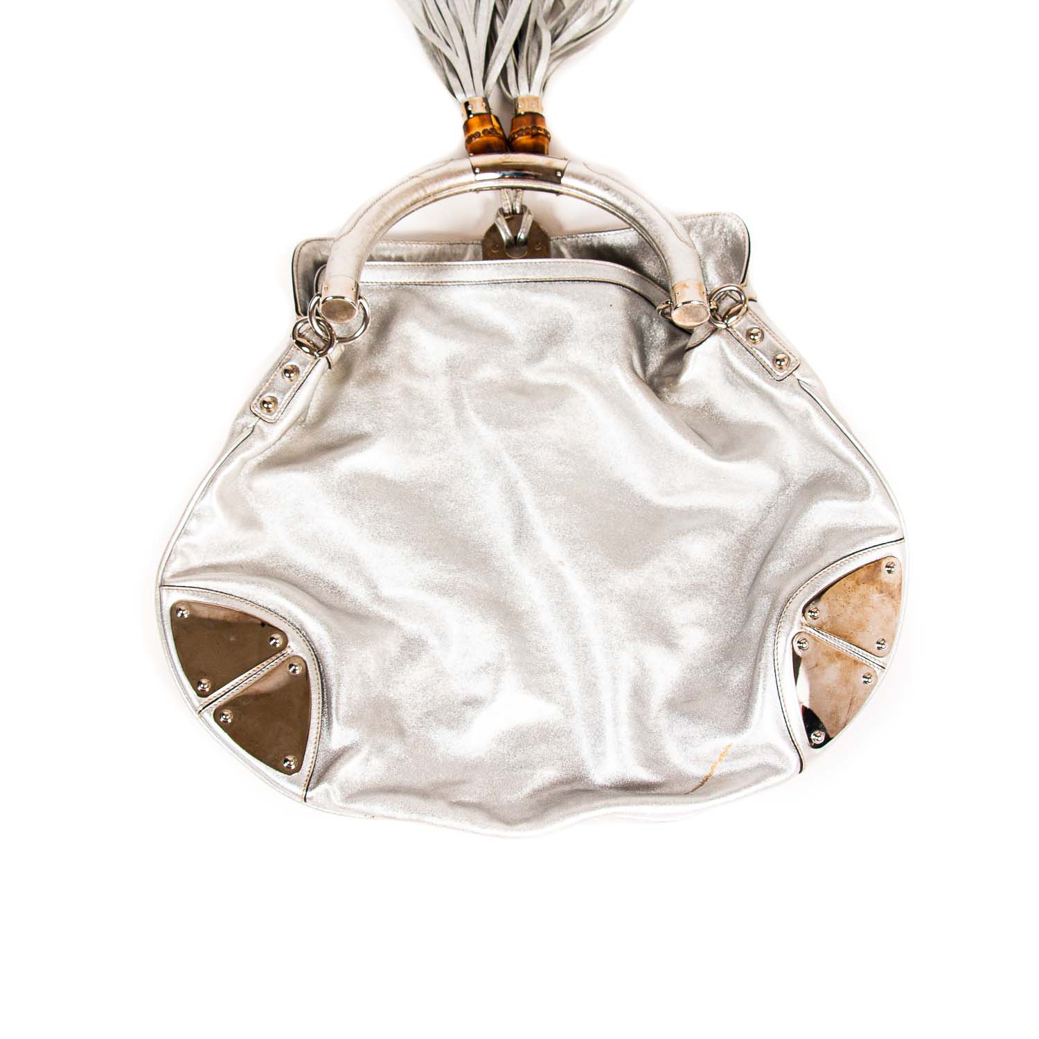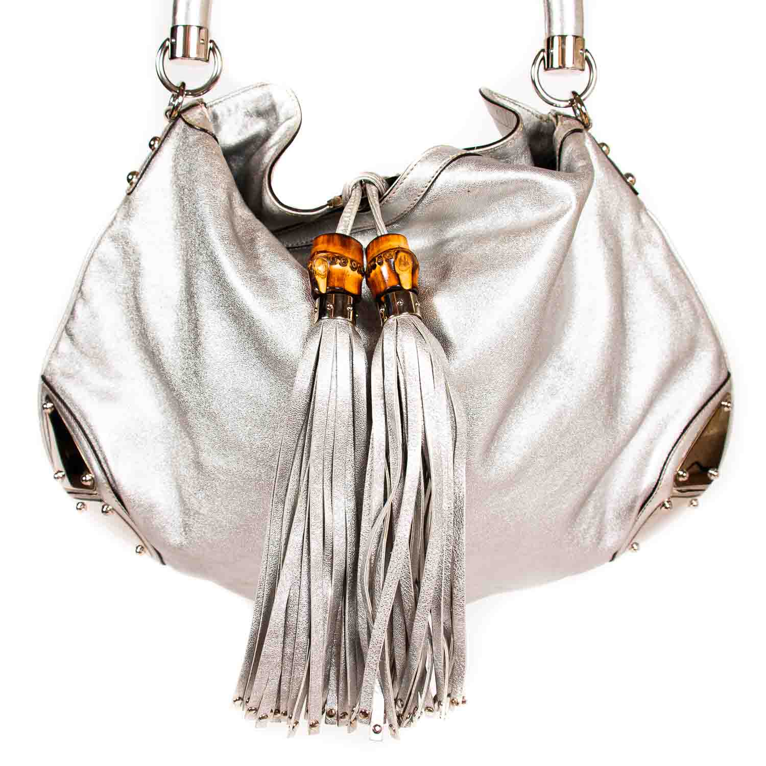 Details: Silver Metallic Leather / Silver-Tone Hardware / Single Rolled Handle / Green Printed Canvas Lining / Single Compartment / Zipper and Phone Pocket at Interior Wall / Front Flap Closure Featuring Bamboo and Tassel Adornment