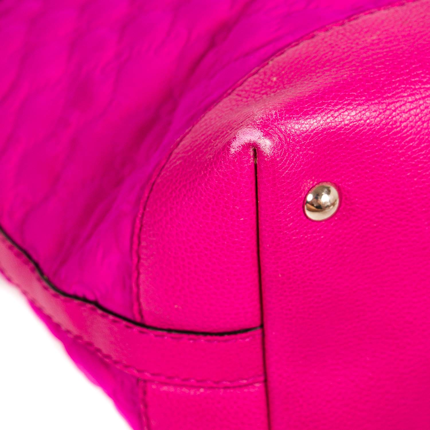Details: Fuchsia Coated Canvas / Fuchsia Leather Trim / Silver-Tone Hardware / Dual Rolled Handle / Leather Base with Studs / Black Fabric Lining / One Compartment with Zipper Pocket and Two Phone Pockets / Magnetic Snap Closure at Top