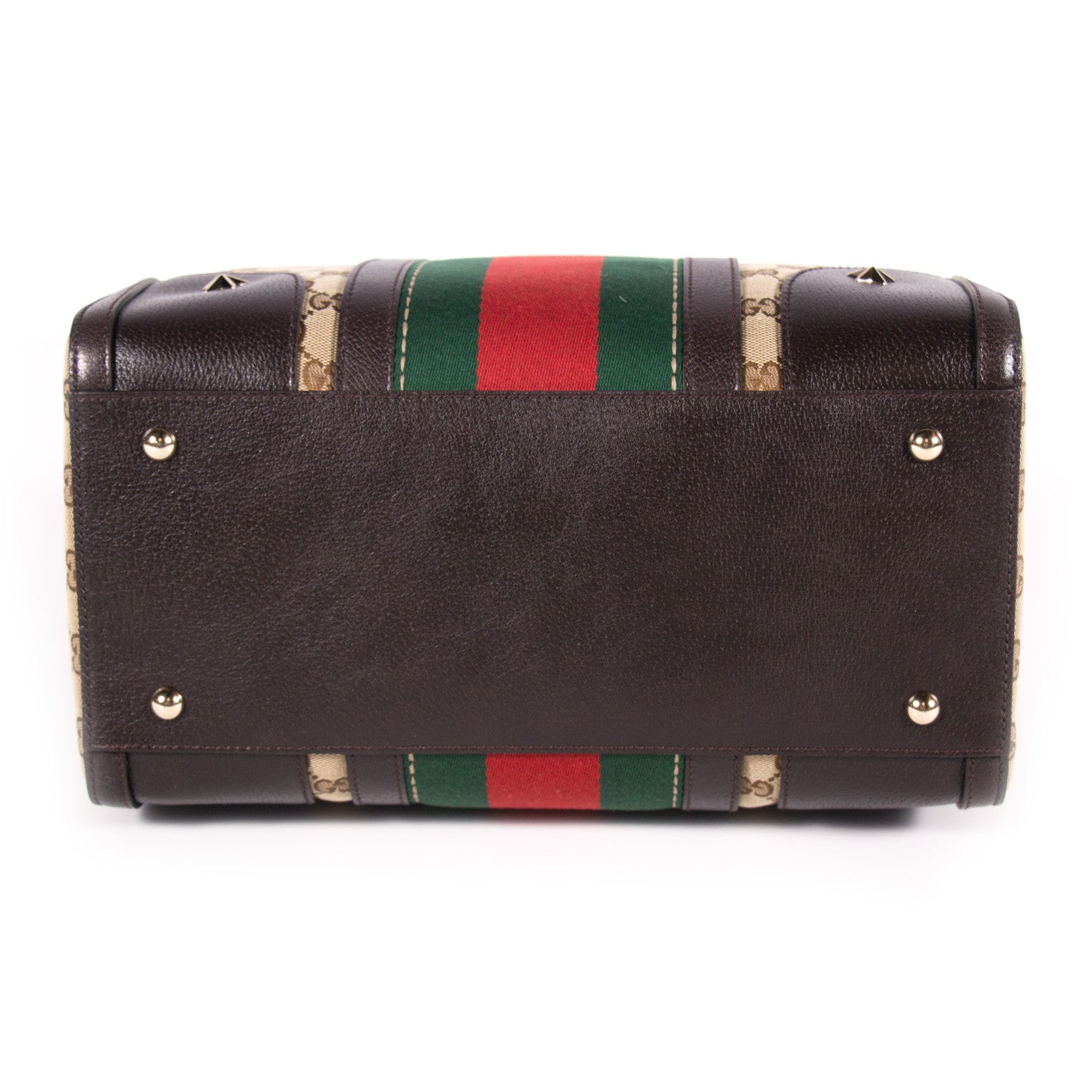 Details: Beige Ebony And Dark Brown Coated Canvas / GG Supreme Motif With Red And Green Stripes / Brown Calf Leather Trim / Two Stars Studs and And Embroidered Bee From The Front / Detachable Removable Shoulder Strap / Dual Rolled Handles / Beige Fabric Interior Lining / Single Zip Pocket And Dual Slit Pockets At Interior / Zip Closure At Top / Protective Studs At Base