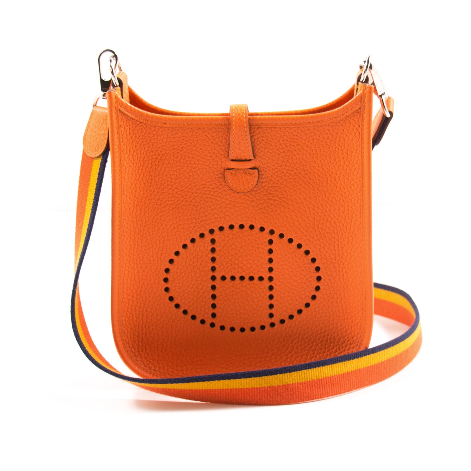 Details: Feu Orange Clemence Leather / Palladium Hardware / Tricolor Shoulder Strap (Blue, Yellow, and Orange) /Large Perforated H Icon In Circle At Front / Feu Untreated Leather Lining / Snap Closure at Back