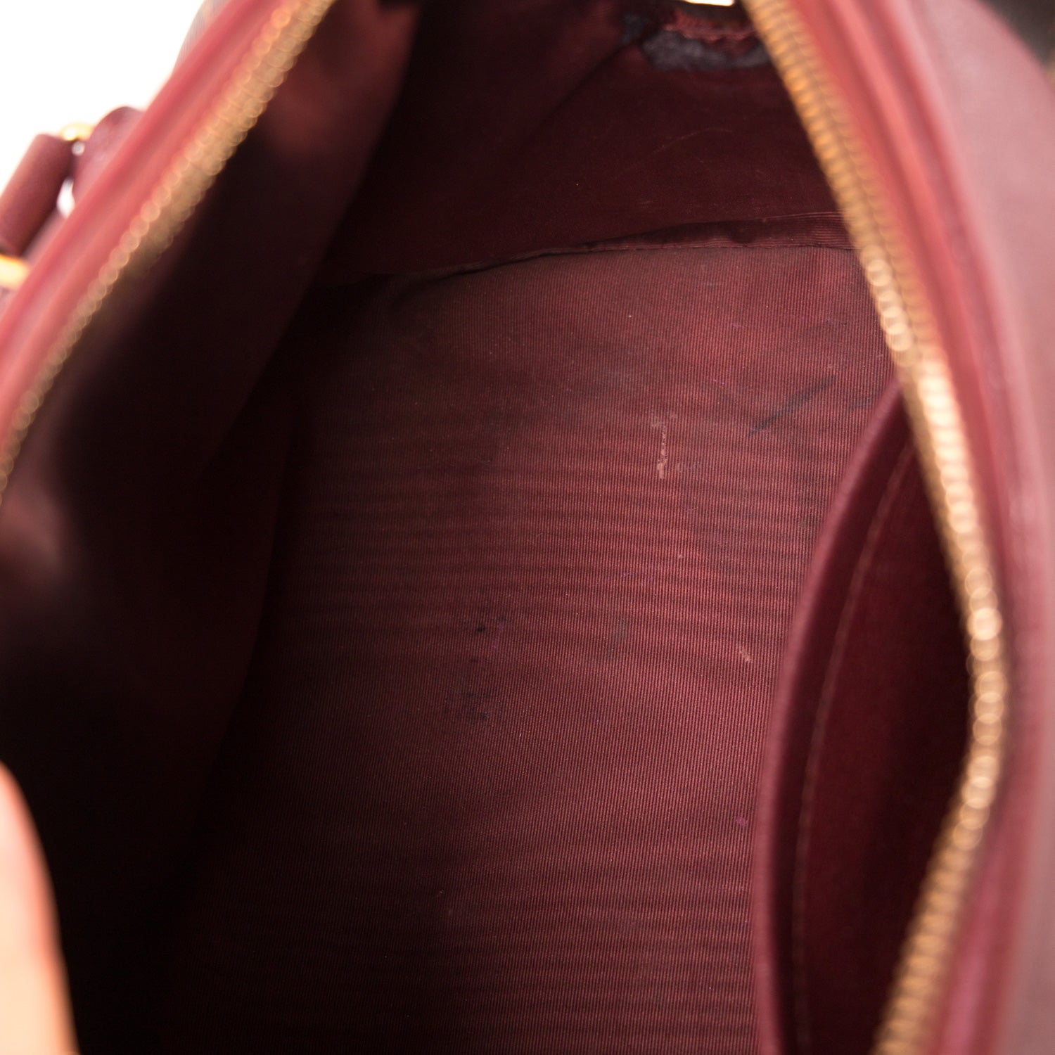 Details: Monogram Coated Canvas / Brass Hardware / Dual Rolled Handles / Burgundy Leather Trim Throughout / Maroon Woven Lining / Single Slit Pocket at Interior Wall / Zip Closure at Top / Magnetic Snap Closure at Front Flap