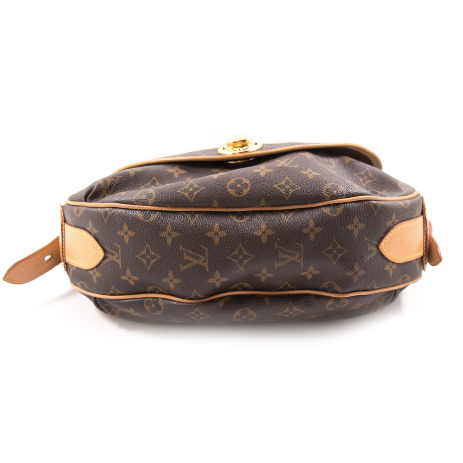 Details: Monogram Coated Canvas / Brass Hardware / Adjustable Shoulder Strap with Leather Pad / Tan Vachetta Leather Trim / Exterior Pocket at Front with Turn-Lock Closure / Brown Canvas Lining / Two Slit Pocket at Interior / Zip Closure at Top