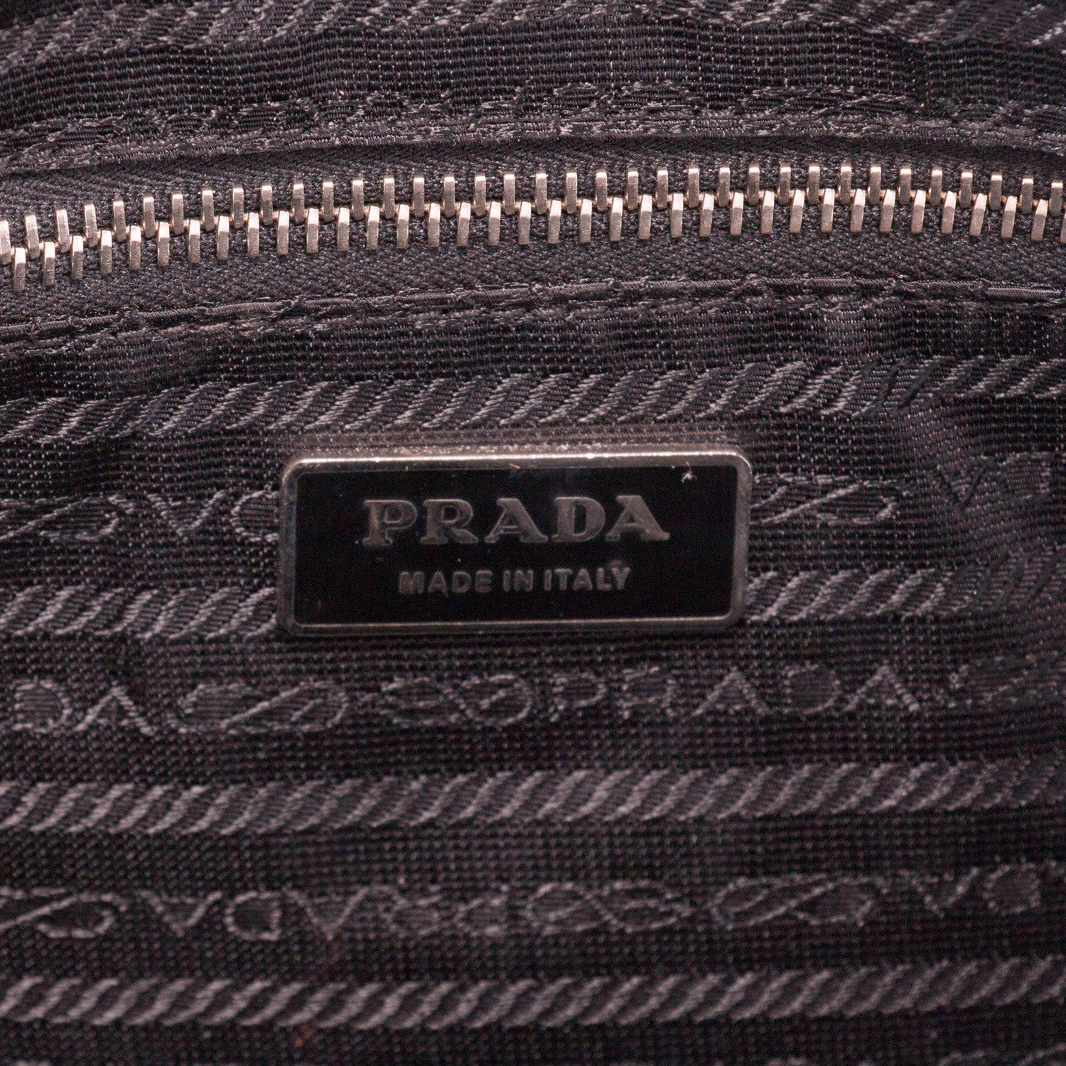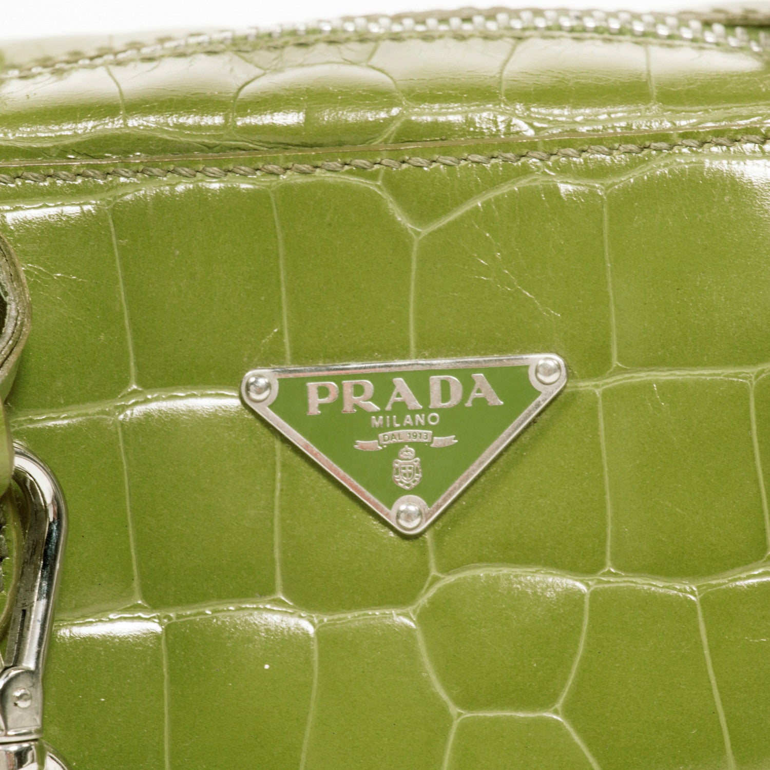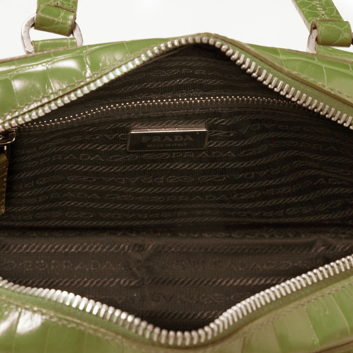 Details: Khaki Crocodile Leather / Silver-Tone Hardware / Tethered Leather Clochette / Black Woven Jacquard Fabric Interior Lining / Dual Rolled Top Handles / Single Pocket At Interior Wall With Zip Closure And Zip Closure At Top/ Comes with Prada Flower Key Chain
